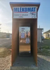 Prodejní automat na čerstvé chlazené mléko je umístěný u vrátnice ve vjezdu do areálu střediska Hadačka.